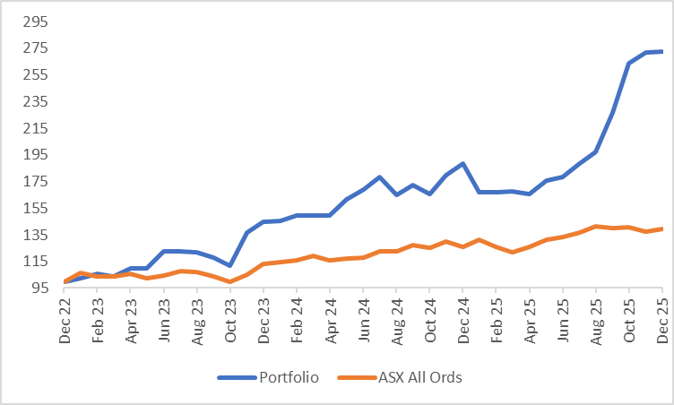 December brought to an end our 7-month streak of beating the market. The portfolio returned 0.17% against the All Ords Accumulation at 1.26%. In 2025, the portfolio returned 44.73%, well ahead of the All Ords Accumulation at 10.56%.